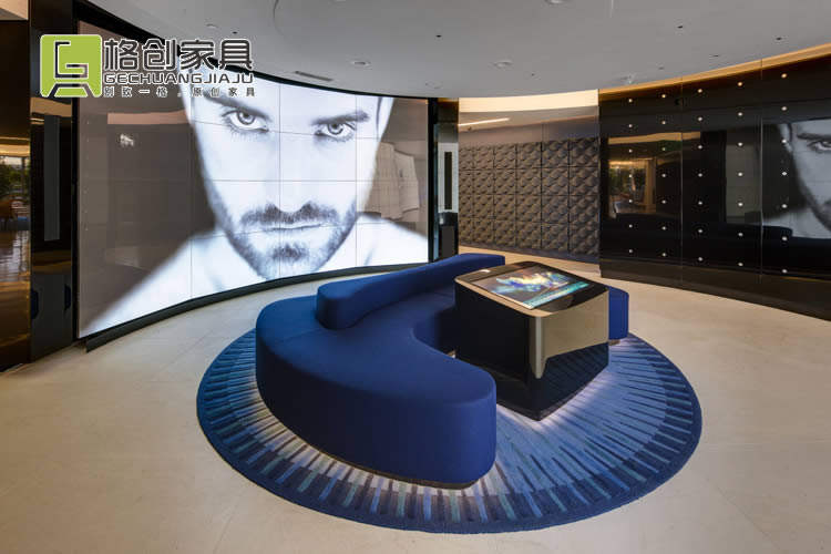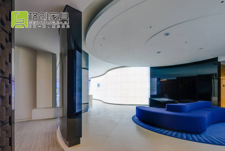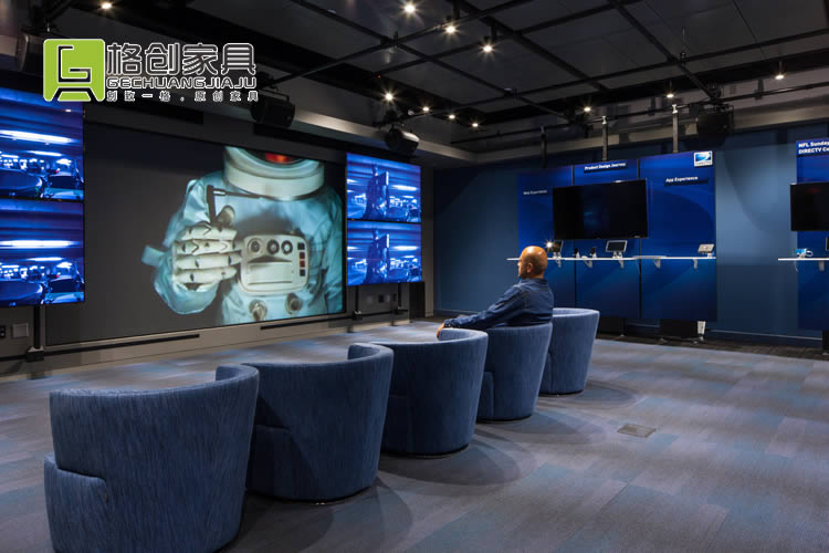 會(huì)議室也是采用同款風(fēng)格的辦公家具,不過這里除了黑色和白色之外,還墻壁和地板都采用了藍(lán)色色調(diào),更有利于員工冷靜頭腦,在這能夠獲得更好的開會(huì)效果。