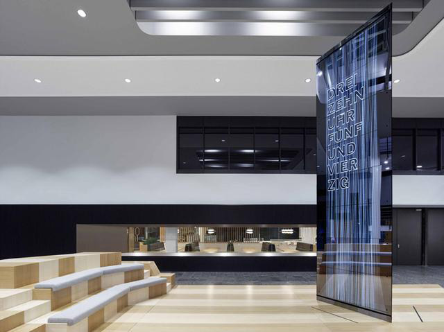 這座酷炫的玻璃裝置猶如鐘塔般顯示著日期時間,矗立在大廳中央。除了顯示時間,裝置還會感知進出大廳的人員情況轉(zhuǎn)換顯示“知識”和“教育”等詞語,以及公司的當(dāng)?shù)氐膶崟r新聞。