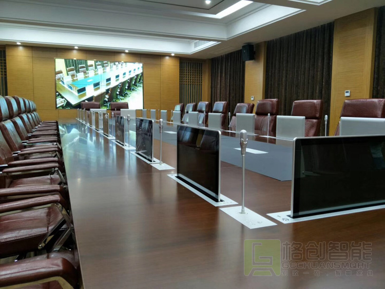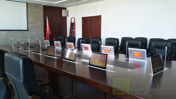 眾所周知,會議室是領導們開會傳達政策和指示精神的重要場所,所以在會議使用過程中絕不能出絲毫差錯。格創智能的無紙化液晶升降一體機終端,在會議召開時,將通過上升的方式展現于會議桌面以上,方便參會者觀看和瀏覽會議資料,并通過觸摸操作參與會議討論與交流;在會議結束之后一體機內所含的升降器將通過降下的方式收納于放置在會議桌面以下的一體機機體內,防盜、防塵,保持會議室的美觀與整潔。