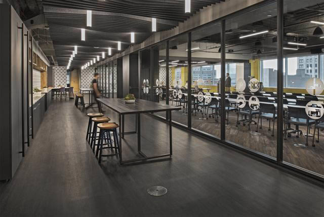 工作場所圍繞三個非正式聚集點展開:接待大廳(如同居家客廳)、兩個服務區(qū)(帶有廚房和餐廳)。裸露的天花板、木地板質(zhì)感地面、木飾墻板和金屬構(gòu)造,以此營造溫暖的工業(yè)美學空間和匠人氣息。