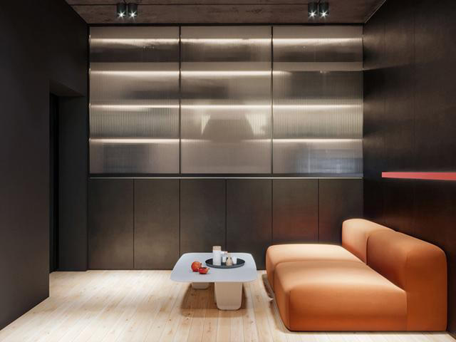 活力珊瑚橘配色,是本案的亮點。粗礪硬朗的混凝土頂面、暗黑色的背景,與柔美的珊瑚橘和干凈的磨砂白制作的屏風立面形成鮮明的質感對比。會議室延續(xù)這樣的設計手法,以輕柔與暗黑的對比,帶來強烈的視覺美感。